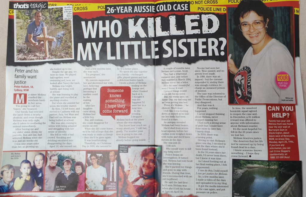 We would like to express our thanks to the NSW Unsolved Homicide Squad and the detectives investigating Melissa’s murder, for the professional and respectful approach you are taking. We thank the NSW Government for the $1 million reward announced in December 2020. And we are especially thankful for any person who has come forward with information – it is greatly appreciated.